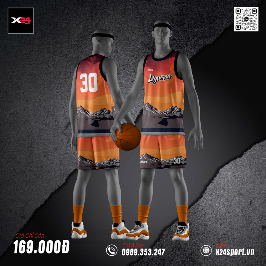 Sự kết hợp giữa gam màu cam – đỏ – vàng hoàng hôn với họa tiết núi non độc đáo trên nền chất liệu co giãn, thoáng khí mang đến bộ đồng phục bóng rổ không chỉ bắt mắt mà còn cực kỳ tiện dụng khi vận động.